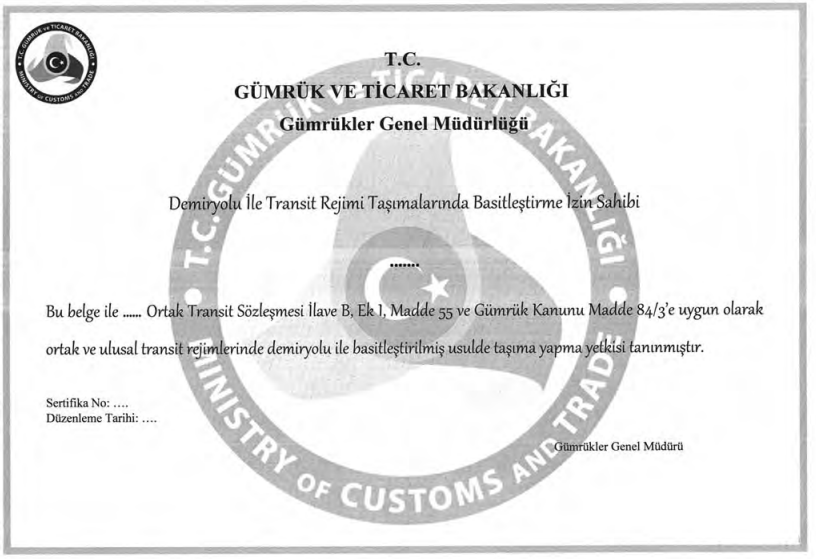 Eşyanın demiryolu ile taşınmasına ilişkin basitleştirilmiş usul çerçevesinde, Gümrük Yönetmeliğinin 235 inci maddesi ve Gümrük Genel Tebliği (Transit Rejimi) (Seri No:6) kapsamında başvuruda bulunan………………………………………………… .ticaret unvanlı firmamıza verilmesini talep ettiğimiz izin kapsamında, 22/6/2012 tarihli ve 6333 sayılı Kanunla onaylanması uygun bulunan 20/5/1987 tarihli Ortak Transit Rejimine İlişkin Sözleşme, 4458 sayılı Gümrük Kanunu, Gümrük Yönetmeliği ve Gümrük Genel Tebliği’nin (Transit Rejimi) (Seri No:6) öngördüğü bütün hususlara uyacağımızı; başvurumuzda sunulan bilgi ve belgelerin doğru ve gerçek olduğunu; izin sahibinin yerine getirmesi gerekli tüm yükümlülükleri kabul ettiğimizi; izin kapsamında yapılacak transit işlemlerinde bir gümrük yükümlülüğünün doğduğunun tarafımıza bildirilmesi halinde, gümrük vergileri ile masraflar ve arızi masraflar dahil diğer yükler için tahakkuk ettirilen tutarı, gecikme faizi ve gecikme zammı ile birlikte süresi içinde ödeyeceğimizi; izin kapsamı işlemleri ilgili mevzuat hükümlerine uygun olarak gerçekleştireceğimizi; aksine bir durumun tespit edilmesi halinde doğacak tüm idari, mali ve hukuki sonuçları kabul edeceğimizi beyan ve taahhüt ederim/ederiz.