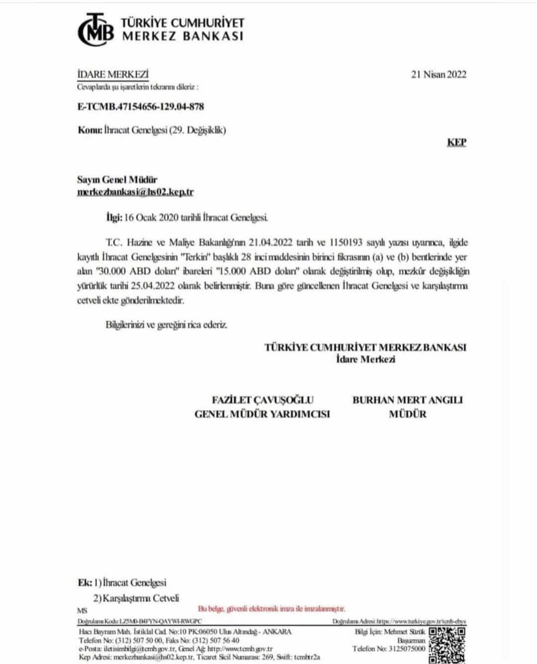 T.C. Hazine ve Maliye Bakanlığı’nın 21.04.2022 tarih ve 1150193 sayılı yazısı uyarınca, ilgide kayıtlı İhracat Genelgesini “Terkin” başlıklı 28 inci maddesinin birinci fıkrasının (a) ve (b) bentlerinde yer alan “30.000 ABD dolan” ibareleri” 15.000 ABD doları” olarak değiştirilmiş olup değişikliğin yürürlülük tarihi 25.04.2022 olarak belirlenmiştir. Buna göre güncellenen ihracat Genelgesi ve karşılaştırma cetveli ekte gönderilmektedir.