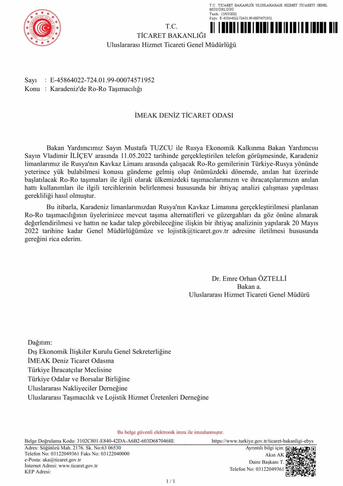 Bu itibarla, Karadeniz limanlarımızdan Rusya’nın Kavkaz Limanına gerçekleştirilmesi planlanan Ro-Ro taşımacılığının üyelerinizce mevcut taşıma alternatifleri ve güzergahları da göz önüne alınarak değerlendirilmesi ve hattın ne kadar talep görebileceğine ilişkin bir ihtiyaç analizinin yapılarak 20 Mayıs 2022 tarihine kadar Genel Müdürlüğümüze ve lojistik@ticaret.gov.tr adresine iletilmesi hususunda gereğini rica ederim.
