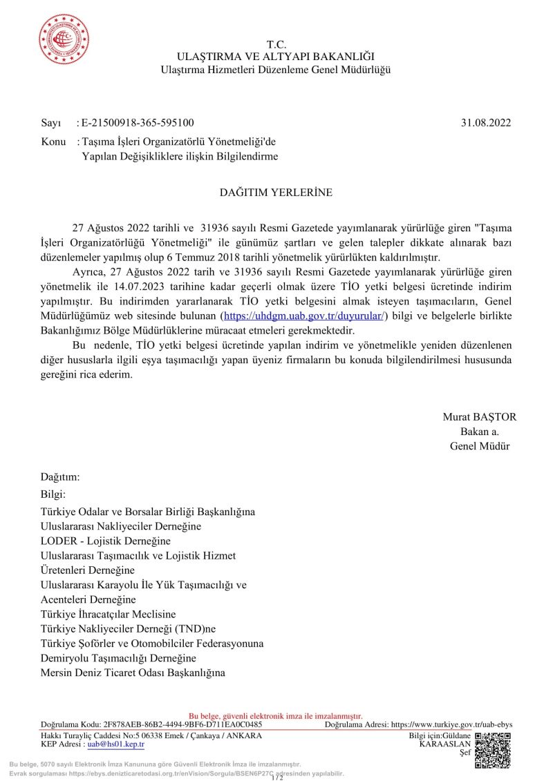 Bu nedenle, TİO yetki belgesi ücretinde yapılan indirim ve yönetmelikle yeniden düzenlenen diğer hususlarla ilgili eşya taşımacılığı yapan üyeniz firmaların bu konuda bilgilendirilmesi hususunda gereğini rica ederim.
